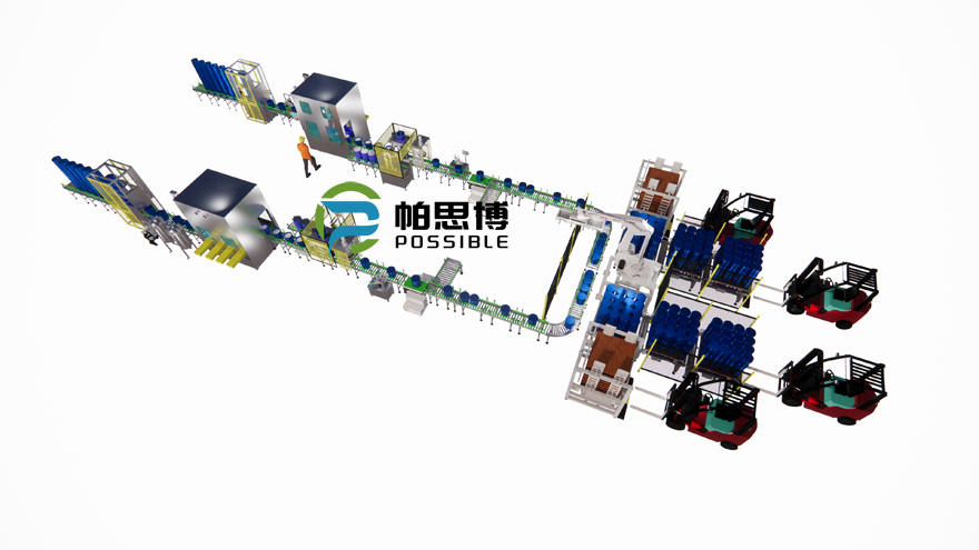 The filling line includes: empty barrel unstacking and sorting machine, 6-head automatic filling system for 20L-30L round barrels, automatic lid covering and pressing system, high-speed barrel label pasting, label inspection, weight inspection and rejection, fully automatic unpacking, packing, sealing, and labeling system, palletizing, film wrapping, and finished product conveying system, and control system. Relying on the automatic material conveying control system on the automated production line, materials can be quickly, smoothly, safely, and accurately transported, ensuring product quality, reducing labor costs, and improving production efficiency. The electrical control part of this machine is composed of PLC programmable controller, frequency converter, etc., with strong control capability and high automation level. Special devices are used to avoid material waste and pollution, such as no filling without barrels and no filling if the barrel mouth is not aligned. It can be customized according to the actual needs of customers, and special models can be designed